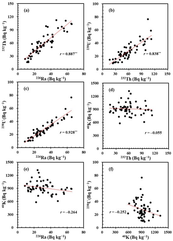 Correlation between 226Ra, 232Th, 238U, and 40K activity concentrations in surface sediments collected from major river watersheds in Korea ((a): 232Th–226Ra, (b): 238U–232Th, (c): 238U–226Ra, (d): 40K–232Th, (e): 40K–226Ra, (f): 238U–40K). ** Correlation is significant at the 0.01 level (two-tailed test).