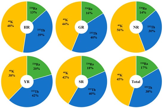 When the contribution of 226Ra, 232Th, and 40K radionuclides to the mean value of AEDRout was evaluated (Figure 5), we found that the contribution to the total watershed was dominated by 40K radionuclides, in the following order 40K (45%) > 232Th (38%) > 226Ra (17%). In general, the 238U and 232Th series and the 40K radionuclides had a high contribution to the AEDRout value [1], which is consistent with the results of many studies conducted on soils [36,50,51,52,53]. The contribution of these radionuclides by major river watershed was as follows: 40K (48%) > 232Th (39%) > 226Ra (13%) for HR; 40K (44%) > 232Th (40%) > 226Ra (16%) for GR; 40K (56%) > 232Th (30%) > 226Ra (14%) for NR; 232Th (42%) > 40K (38%) > 226Ra (20%) for YR; and 40K (42%) > 232Th (40%) > 226Ra (18%) for SR. Although the overall radionuclide contributions were consistent among all watersheds, the contribution of 40K radionuclides was higher in the NR than in the other watersheds, and the contribution of 232Th radionuclides was the highest in the YR watershed. Overall, the contribution to the AEDRout value was dominated by the 40K and 232Th radionuclides. These results tend to be consistent with those obtained in previous studies, which are as follows: China Wei River, 40K (50%) > 232Th (33%) > 226Ra (17%); and India Bharathapuzha River, 232Th (49%) > 40K (28%) > 226Ra (23%) [12,18]. Notably, the sediments from streams and rivers around Kanyakumari, India, where background radiation is high, indicated a very high contribution of 232Th radionuclides, up to approximately 87% [25]. The differences in the contribution of these radionuclides to the AEDRout depend on the activity concentrations in the study area, and the activity concentrations of these radionuclides are closely related to geologic characteristics. Future studies should aim to understand the geology around the watersheds to clearly evaluate the differences in the contribution of these radionuclides.