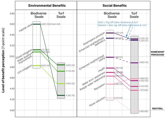 Comparisons of perceived environmental and social benefits of biodiverse and turf swales. #.##(#.##) represents the mean (standard deviation) of each perceived benefit for either biodiverse or turf swales. The solid lines indicate statistically significant differences between biodiverse and turf swales, while the dashed lines indicate non-significant differences.
