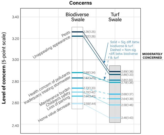 Comparison of concerns over biodiverse and turf swales. #.##(#.##) represents the mean (standard deviation) of each perceived concern for either biodiverse or turf swales. The solid lines indicate statistically significant differences between biodiverse and turf swales, while the dashed lines indicate non-significant differences.