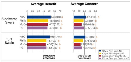 Comparisons of the perceived average benefit and concern for biodiverse and turf swales across the four study areas. #.##(#.##) represents the mean (standard deviation) of average perceived benefit/concern in each area. The differing letters (a–c) indicate significant city/county differences.