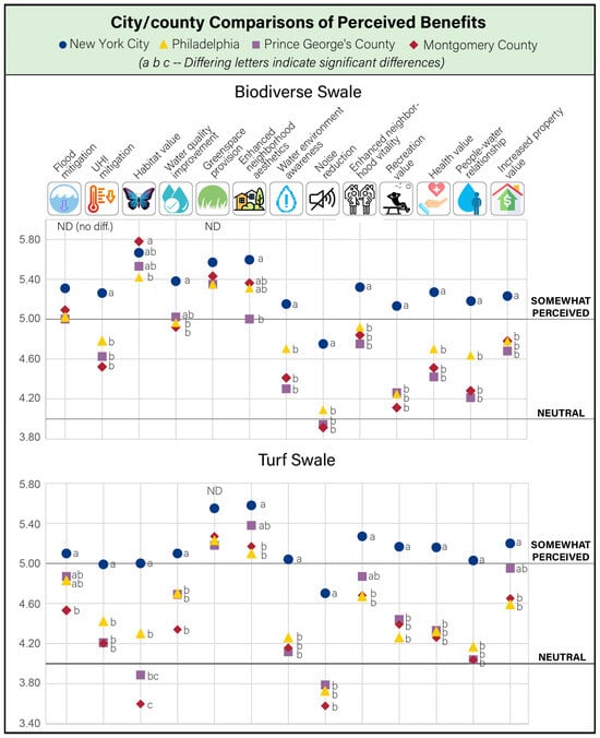 Perceptions of individual benefits of biodiverse and turf swales across the four study areas. ND indicates no significant differences while differing letters (a–c) indicate significant differences.