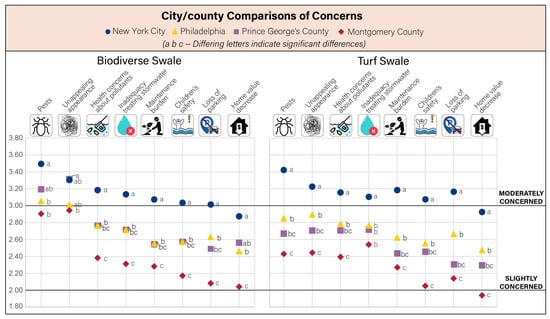 Regarding city/county differences in individual concerns, biodiverse swales showed a more complex pattern than turf swales (Figure 5 and Table S11, Section S2). For biodiverse swales, in most cases (6 out of 8 concern aspects), NYC participants indicated significantly higher concerns than two or three other locations. In some cases (2 out of 8), MoCo participants showed significantly lower concerns than all three other locations. Concern level was the most similar across cities for “unappealing appearance”, with only one pairwise difference (NYC > MoCo). In contrast, for turf swales, the primary pattern (7 out of 8) is that NYC participants indicated significantly higher concerns than all three other locations, with one additional pairwise difference (Philly > MoCo).
