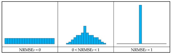 We applied the NRMSE method, as used by Kim and Kim [], to analyze the spatial variability of rainfall through hyetographs and quantify the deviation of rainfall amounts by the ordinate based on peak rainfall. The resulting index, the NRMSEpeak (hereinafter referred to as the NRMSEp), is normalized to the total rainfall and ranges from 0 to 1, regardless of the rainfall amount (Figure 2). When rainfall is uniformly distributed across all ordinates (i.e., when the rainfall intensity is constant throughout the event), the NRMSEp is 0. As rainfall becomes more concentrated at a specific ordinate, the NRMSEp increases. In cases where the total rainfall is concentrated at a single ordinate, the NRMSEp reaches 1.