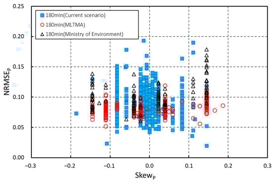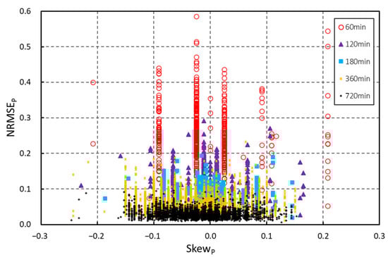 In total, 12,925 hyetographs were generated, encompassing 449 short-term and 5789 long-term scenarios with durations ranging from 60 to 720 min. The relationship between skewp and the NRMSEp was analyzed for each hyetograph (Figure 5). The theoretical range for the NRMSEp is between 0 and 1, but in this study, values were observed below 0.6, with a minimum of six rainfall ordinates. When rainfall intervals are constant, the NRMSEp tends to be higher owing to a greater distribution of rainfall towards specific ordinates, especially when the duration is shorter, resulting in a smaller number of hyetograph ordinates.