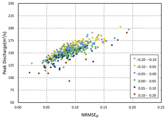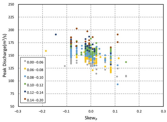 This study utilized a representative rainfall duration of 180 min to calculate peak flood discharge for 449 short-term rainfall scenarios at the BW08 location. The relationship between the NRMSEp and peak flood discharge was examined for each hyetograph. To mitigate the influence of skewp, it was categorized into equal intervals with a spacing of 0.05–0.1. The skewness classes in skewp demonstrated a positive linear correlation with both the NRMSEp and peak flood discharge (Figure 8, Table 2). Specifically, as rainfall becomes more concentrated at a specific point relative to the total rainfall, the peak flood discharge in the rainfall–runoff relationship becomes significantly larger. This trend likely results from the direct effect of rainfall timing on peak flood discharge determination at the unit hydrograph.