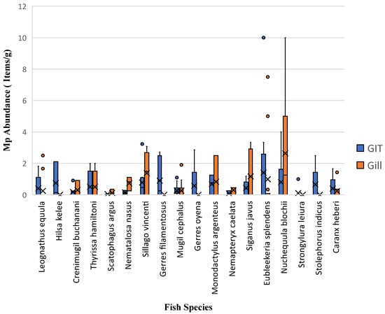 Box and whisker plot of the mean microplastic abundance (items/g w.w. tissues) in fish gastrointestinal tract and gills.