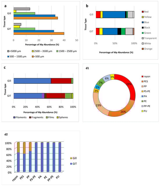Composition of ingested/inhaled microplastics characterized by size (a), colour (b), morphology (c) and polymer type (d1) in GIT and gill (d2).