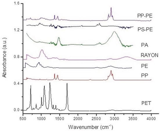 A total of 98 particles (49% of the total) were analysed using μ-FTIR, to confirm if the particles extracted were plastic and to determine their chemical composition. The particles chosen were evenly distributed across all fish samples and size fractions (Figure 3d). The types of polymers identified were polyethylene terephthalate/polyester (PET) (26%), polypropylene (PP) (23%), polypropylene–polyethylene copolymer (PP-PE) (6%), polystyrene–polyethylene copolymer (PS-PE) (3%), polyethylene (PE) (7%), spandex (PU) (3%), polyamide (PA) (3%), and 29% of the particles analysed were assigned as rayon, a semi-synthetic cellulose filament, which is not categorized as a plastic (Figure 5). But taking into account its anthropogenic source and similar behaviour often counted together with MPs. It is interesting that many studies already reported the identification of rayon/viscose fibres in the gastrointestinal tract of fish, and concluded that filamentous fibres are also a major source of microplastic debris in the deep sea [98,99]. Rayon, PET and PP were observed in the gills in minor percentages, while more polymer types were observed in the fish gut.