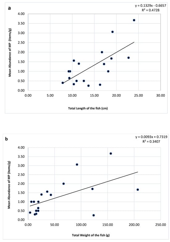 Spearman correlation between total length (a) and total body weight (b) of the fish and MP abundance of fish samples.