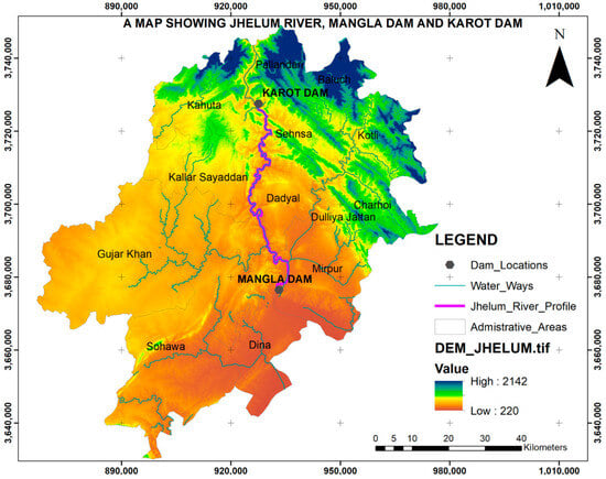 Location of the Jhelum River, showing Karot Dam and Mangla Dam.