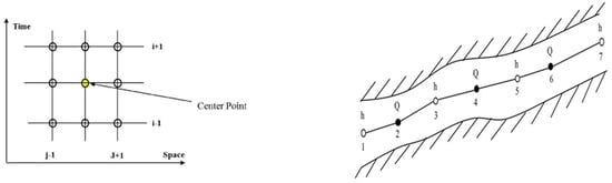 In MIKE 11, dispersion is achieved by using a 6-point Abbott central difference format, and the dispersed linear equation set is solved by using the Double Sweep Algorithm shown in Figure 2. On the basis of an implicit, finite difference, the MIKE 11 equations are discretized. These schemes are essential for accurately predicting hydrodynamic behaviors during dam breaches [].