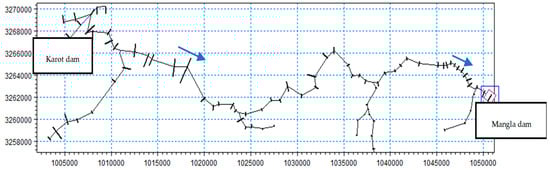 The river network module contains certain details about the river channel, including flow direction, computation range, and river mileage, as well as the distance from the Karot Dam site to the Mangla reservoir.