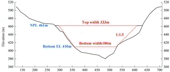 Figure 4 shows a schematic diagram of the dam breach processes of Karot Dam, which occurs when the average annual inflow is sustained over several years, in accordance with related codes and regulations for dam-break flow []. The process of a dam breach can be roughly characterized as a trapezoid-shaped gate. As soon as the water level in the Karot hydroelectric station’s reservoir reaches the Normal Pool Level of 461 m, the bottom elevation of the dam breach will gradually decrease from 461 m to 410 m over time. Under conditions of multi-year average inflow, the breach width will increase linearly from 0 m to 180 m, with the left- and right-side slopes maintained at a ratio of 1:1.5 (vertical/horizontal). This trapezoidal dam breach shape will persist for two hours.