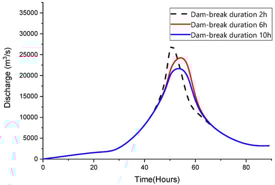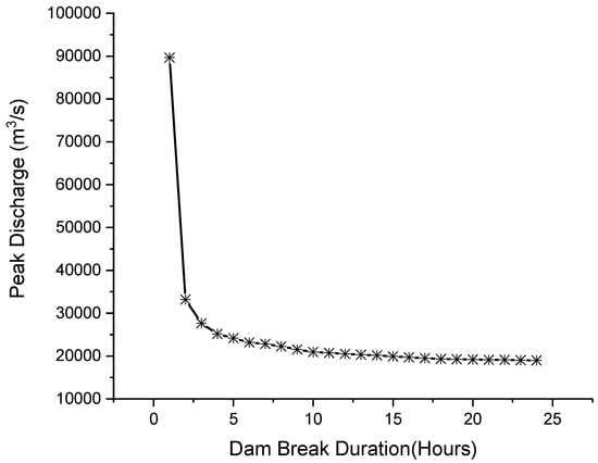 At the Karot Dam site, Figure 5 illustrates the discharge process under different dam-break durations, while Figure 6 shows the same processes under varying durations. It is evident that, immediately after the dam break, the Karot Dam site experiences a high peak discharge initially, but the flood peak duration is short. Peak discharge decreases by 70,670 m3/s, from 89,671 m3/s to 19,001 m3/s, as the dam-break duration increases from 1 to 24 h. Peak discharge declines rapidly with shorter breach times when the break lasts less than two hours, but increases in peak discharge become negligible if the duration exceeds 10 h.
