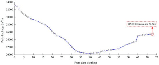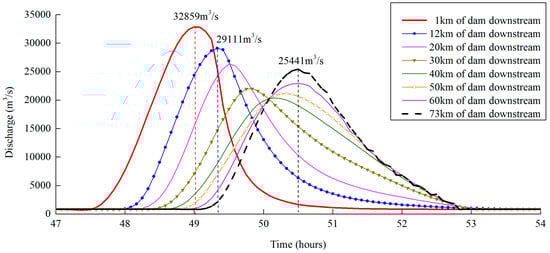Figure 11 shows the dam break-out flow at different river cross-sections’ flood attenuation hydrographs and the one-way discharge process of a typical downstream section of the dam following the Karot Dam break under multi-year average inflow conditions. The dam-break flood propagates rapidly, as reflected by the time it takes for the flood peak to appear. The flood peak reaches locations 12 km, 20 km, 50 km, and 73 km downstream of the dam in 22 min, 32 min, 1 h 18 min, and 1 h 30 min, respectively, with an average travel speed of 0.5 to 2.5 km per minute. The rapid downstream water flow over short distances is demonstrated by the inverse relationship between discharge and distance from the dam.