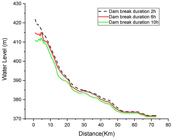 Figure 8 shows that as the dam-break duration increases from 1 to 10 h, the highest water levels between Karot Dam and Mangla Dam decrease, particularly from 45 km downstream. The peak discharge at the 45 km mark is reduced due to the influence of the river network, Mangla reservoir, and tributaries, which disperse the flood water and lower the peak.