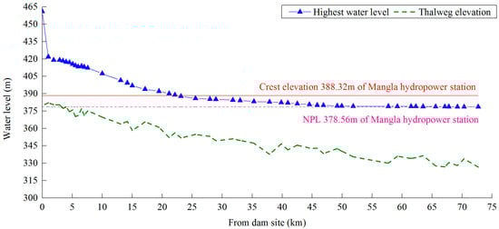 Figure 9 shows that the peak discharge of 12,097 m3/s from the flood caused by the dam collapse at the Mangla dam site is significantly lower than the maximum discharge capacity of 30,147 m3/s for the normal spillway of the Mangla Hydropower Station under Normal Pool Level (NPL). According to the dispatching schemes of the Mangla Hydropower Station, the reservoir water level can be maintained at the Normal Pool Level (378.56 m).