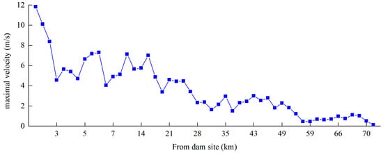 3.3. The One-Way Maximum Velocity Flow Process from the Dam Site to Downstream