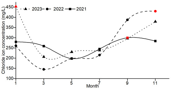 Changes in chloride ion concentrations by year. Note: The red symbols are the maximum chloride ion concentrations during the year.