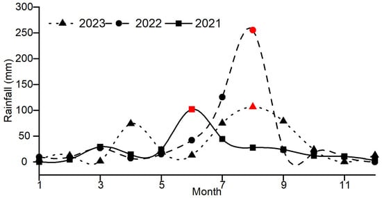 Monthly rainfall changes from 2021 to 2023. Note: The red symbols are the maximum rainfall during the year.