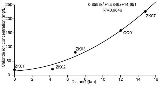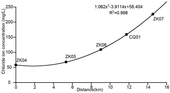 The scatter plot of the distance–chloride ion concentration for profile BB’ is shown in Figure 5; the fitting equation for the variation of chloride ion concentration with distance is , which has a coefficient of determination of , indicating a good fit, and the background value of the corresponding chloride ion concentration at the long-term monitoring point is 158.95 mg/L.