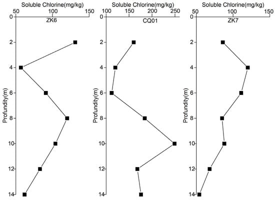 Soil samples were taken from the sampling points CQ01, ZK06, and ZK07 to test the soluble chlorine content in the soil layers at various burial depths. The results are shown in Table 2. It can be observed that the soluble chlorine content in the soil at sampling point CQ01, which is located in an irrigated farmland area, is higher than that at ZK06 and ZK07, which are located in a grassland area. This indicates that chloride ions in the groundwater are significantly retained in the soil due to irrigation.