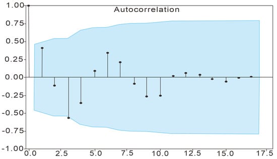 ACF analysis results. Note: The blue region represents the confidence interval with a confidence level of 95%.