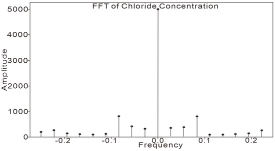 The trend of groundwater chloride ion concentration in the study area was further analyzed using a Fast Fourier Transform (FFT); as shown in Figure 8, when the spike frequency is 0, the spike amplitude is 5000, which is much higher than the amplitude of other spike frequencies. Figure 8 shows that the baseline level (background value) accounts for the major part of the overall concentration of chloride ions in groundwater in the study area; the spike amplitude is 965.60095 when the spike frequency is 0.08333, which is the maximum value except for the spike frequency of 0. Since the sampling frequency is one sample every two months, the variation period of chloride ion concentration in the study area is months.
