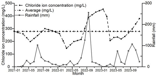 Figure 3 shows that the rainfall is slightly higher from March to April every year. Meanwhile, from June to September, rainfall averages 71.1% of the year. Among them, 2022 was relatively rainy and had the highest rainfall for the year. This variation coincides with the variation of chloride ion concentration to some extent, and the effect of rainfall on chloride ion concentration continues for some time.