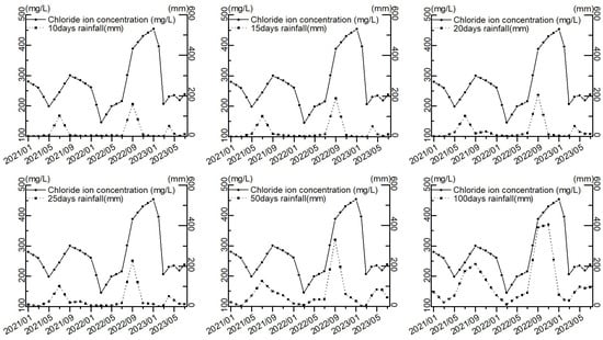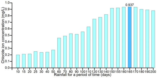 As shown in Figure 9, the trends of chloride ion concentration and rainfall over time are the same, but there is a certain lag between the chloride ion concentration and rainfall changes on the time scale, which indicates that the effect of rainfall on chloride ions is not occurring in real time, so the relationship between the chloride ion concentration and its relationship with the sum of the daily rainfall in the period prior to the time point of the test was further investigated.