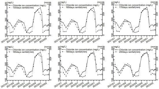 In order to find the cumulative rainfall period with the highest correlation to the chloride ion concentration, the Pearson correlation coefficient method was used to find the correlation coefficients between the cumulative rainfall and the chloride ion concentration in groundwater for the first 10, 15, 20, 25, 30, 40, 50, 60, 70, 80, 90, 100, 110, 120, 130, 140, 150, 155, 160, 165, 170, 180, 190, and 200 days, as shown in Figure 11. The correlation coefficients between the cumulative rainfall and groundwater chloride concentration for the 180, 190, and 200 days and the correlation coefficients with chloride concentration for each time are shown in Figure 11.