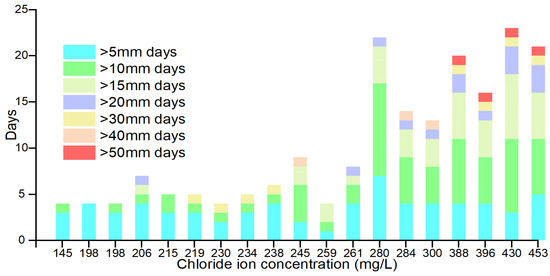 The results of this study were further analyzed by screening the number of days with single-day rainfall greater than 10 mm, 20 mm, 30 mm, 40 mm, and 50 mm within 165 days, respectively, and the number of days with single-day rainfall for each day is shown in Figure 12 and Table 3, which show that rainfall with higher intensity occurred during the 165 days prior to the collection of the samples with a higher concentration of chloride ions. At the sampling time nodes with chloride ion concentrations of 388 mg/L, 430 mg/L, 453 mg/L, and 396 mg/L, there was a single day of rainfall greater than 50 mm during the 165 days prior to sampling. This indicates a certain correlation between rainfall intensity and the concentration of chloride ions in the groundwater during the 165 days and that there is a rainfall threshold value above which rainfall on a single day will have a more obvious effect on the concentration of chloride ions in the groundwater. A single day’s rainfall above this threshold has a more pronounced effect on groundwater chloride concentrations.