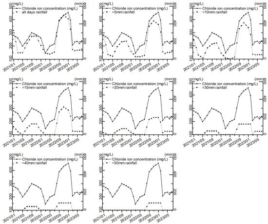 In order to clarify the threshold value of the impact of a single rainfall on the chloride ion concentration in groundwater, the sum of rainfall intensities greater than 10 mm, 20 mm, 30 mm, 40 mm, and 50 mm in a single day within 165 days was calculated, as shown in Table 4. The trend of each rainfall intensity and chloride ion concentration is shown in Figure 4.
