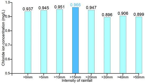 Figure 13 shows that with the increase in rainfall intensity threshold, the rainfall and chloride concentration curves tend to approach and then deviate from each other. Pearson’s correlation coefficients between the rainfall and chloride ion concentration for each rainfall intensity were further investigated, and the correlation coefficients are shown in Figure 14 and Table 5, which show that the correlation coefficients between rainfall and chloride ion showed an increasing trend and then decreasing along with the increase of the rainfall in a single day. This indicates that when screening the single-day rainfall, the single-day rainfall that has no or very little correlation with the chloride ion concentration is first removed. The single-day rainfall with a high correlation with chloride ion concentration is removed later. Therefore, the single-day rainfall with the largest correlation coefficient with the chloride ion concentration is the threshold of single-day rainfall that affects the chloride ion concentration, which is 15 mm. This means that a single rainfall of more than 15 mm can effectively leach chloride ions from the surface soil and carry them to the groundwater.