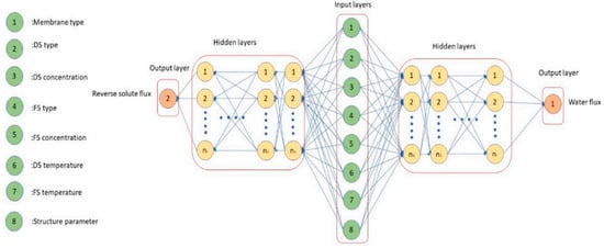 The structure of ANN for predicting the water flux in membranes [100].