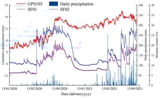 Figure 2 illustrates the temporal variations in cumulative landslide displacement, daily rainfall, and moisture content during the monitoring period. While the rainfall from May to October 2020 was lower than in the same period of 2021, the moisture content curve still exhibited notable peak variations. These variations are linked to the recharge mechanisms of the landslide’s moisture content, detailed as follows: (1) The lower rainfall between May and October 2020 coincided with a significant and abrupt change in moisture content, primarily due to increased irrigation water usage by local residents. (2) The abundant rainfall between May and October 2021 was closely associated with sudden peaks in moisture content, mainly occurring during periods of heavy rainfall.