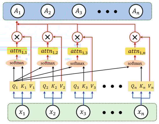 The principle can be summarized as follows: First, attention weights are computed by taking the dot product of the query vector (Q) and the key vector (K). Then, these weights are applied to the value vector (V), yielding a weighted sum of the value vectors across all positions in the sequence. This process produces the output for each time step, as detailed in Equations (6)–(10). The working mechanism of self-attention is illustrated in Figure 3.