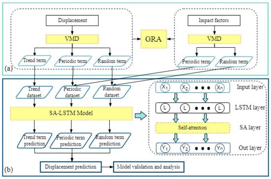 Based on the displacement-time-series theory, VMD theory, and GRA, and incorporating the SA mechanism into the LSTM machine learning algorithm, a dynamic deformation prediction model for the ZVTE landslide has been established. The training process is outlined as follows (Figure 6):