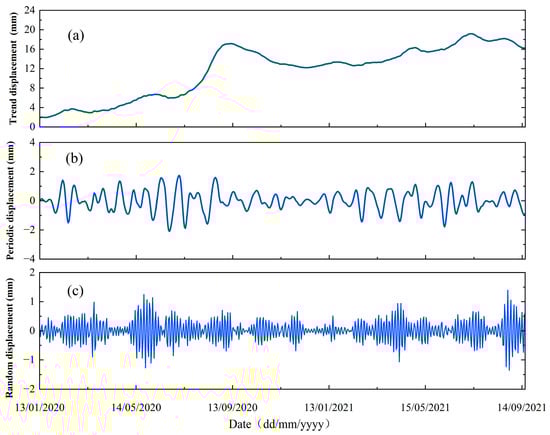 The decomposition results for the cumulative displacement at the GPS105 landslide monitoring point are presented in Figure 7.