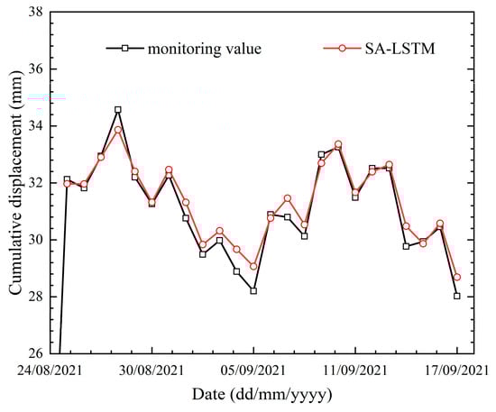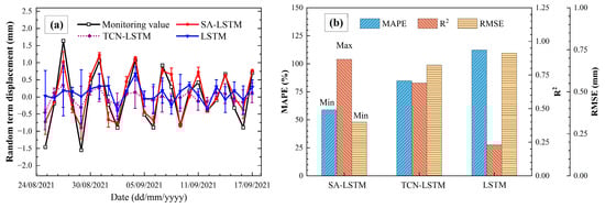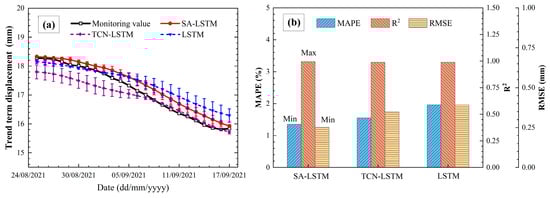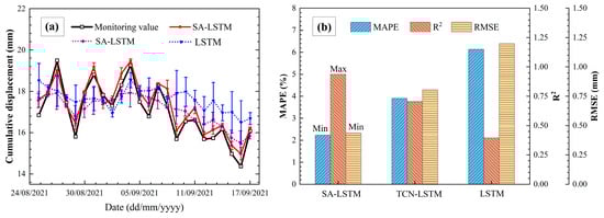 As shown in Figure 9b, the SA-LSTM model achieves better predictive performance, with significantly improved accuracy compared to the LSTM. The SA-LSTM’s prediction results exhibit lower MAPE and RMSE values than both the TCN-LSTM and LSTM models, indicating its superior ability to learn complex deformation mechanisms.