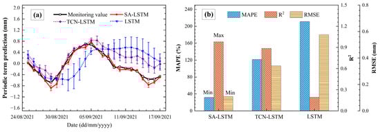 Periodic component displacement prediction: (a) displacement prediction; (b) accuracy metrics comparison.