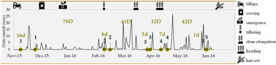 The experiment was conducted during the crop season 2015–2016 at the experimental farm of the Council for Agricultural Research and Economics (CREA-AA), Foggia (41°27′03″ N, 15°30′06″ E). The site is under a long-term field experiment performed on a monoculture of durum wheat [27] that started in 2002 to compare the effect of minimum tillage (MT) and sod-seeding (i.e., no tillage, NT) on crop yields. According to USDA classification, the soil texture is clay, with 42.7% clay and 27.7% silt, and it is classified by Soil Taxonomy–USDA as fine, mesic, Typic Chromoxerert [52]. The experimental design was a completely randomized block design with three replicates and unit plots of 500 m2 each. For both treatments (MT and NT), wheat straw was chopped into 10–15-cm lengths and spread back on the plot in early September. Depending on the seasonal outcome, after 1 month, a chemical weed control was performed. MT consists of a two-layer soil tillage at 40 cm deep (i.e., a chisel and rotary tiller combination) performed in early November. Fertilization and sowing followed after 1 or 2 days. More information on plot management and the main soil properties can be found in Castellini et al. [27].