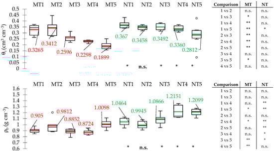 Box plots of soil water content at the time of sampling (θi) and soil bulk density (ρb) carried out for each sampling date (1 to 5) under minimum tillage (MT) and no tillage (NT). The thick red–green line within each box represents the mean value (the fine black line, the median); for improved interpretation, mean values are also reported by numbers. Circles represent outliers. For a given soil management, inferences of the THSD-test between dates (i.e., x vs. y) are summarized on the right (* p < 0.05; ** p < 0.01; n.s. not significant). For a given sampling date, inferences of the two tailed t-test between MT and NT were reported under the NT boxes (* p < 0.05; n.s. not significant).