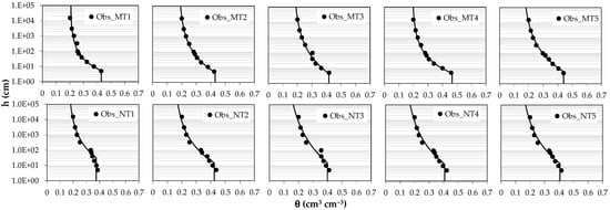 The BC model better fitted the MT than NT data (Figure 3), and the standard error between the estimated and measured water retention data was generally low (<0.003 cm3 cm−3), resulting in being five times higher under NT than MT (Table 1). The worse fit of the BC model for NT was mainly due to the discontinuity of the two data series, i.e., a decoupling of the water retention data obtained on undisturbed (h ≥ −100 cm) and sieved (h < −100 cm) soil samples. This represents an event that, although it did not substantially affect the quality of the fit in our case, can occur when analyzing soil water retention data from both undisturbed and repacked soil samples. Bittelli and Flury [57], for example, coupling measured soil water retention curves determined by pressure plates and dew point potential methods for both undisturbed cores and repacked samples, showed higher theta values for the undisturbed samples and lower values for disturbed ones at a given soil pressure head. A similar result was reported by Schelle et al. [58] when, for a clay loam soil, water retention data from evaporation experiments and the dew point method were considered.