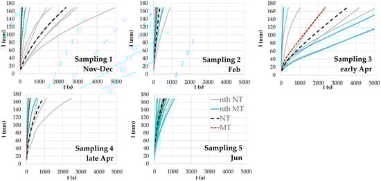 Figure 4 shows the entire dataset of the cumulative infiltration curves measured under MT and NT over the five sampling dates. Overall, the curves exhibit the expected shape, with a downward concave part corresponding to the transient state and a linear part at the end of infiltration that is related to the steady state. A general view would suggest greater variability for first and third sampling dates, as a broad range of infiltration curves was obtained. The parameters that account for the steady-state flow conditions (e.g., time to steady state) suggest a higher variability in the third and fourth sampling dates (for the latter especially under the NT), as relatively higher CV values were observed (Table S1). Excluding some discrepancies in the early season (NT2 and MT3), the τcrit overall increased over time for MT and decreased for NT. The infiltrated depth at the equilibration time, I(τcrit), was 75% of the total infiltrated depth (Itot = 170 mm) for MT and 73% of Itot for NT; this suggests that quasi-steady-state conditions were always recognized before the end of infiltration experiments. Differences in the soil structure and associated bulk densities affected the duration of infiltrations (tend) that, on average, was halved between NT (1540 s) and MT (691 s) (Table S1).