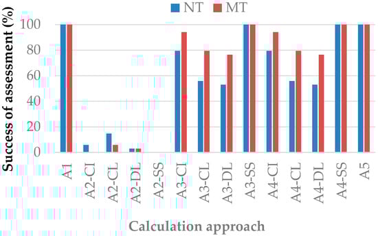 The fourteen calculation approaches applied showed a different ability to return physically valid saturated hydraulic conductivity estimations (Figure 5). Overall, A1 and approaches that used the steady-state information (e.g., A3SS, A4SS, and A5), never failed and returned 100% of the Ks estimations both under MT and NT (i.e., 34 valid values out of 34 infiltration tests). On the other hand, A2 was more deficient, with a sample size that, regardless of transient or steady-state data analysis, never exceeded 5% of the valid Ks estimations. Approaches A3 and A4, applied with transient data, returned 73% valid Ks estimations. Moreover, when the fitting linearization methods were considered, the CI, CL, and DL methods returned 59, 49, and 44% valid Ks estimations. However, regardless of the considered criterion, it seems that data analysis was affected also by soil management, because no Ks estimation was obtained in 43% and 35% of cases under NT and MT, respectively. Given the small sample size obtained with A2, calculation approaches from A2CI to A2SS were excluded from the subsequent data analysis and comparisons.