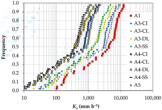 For the minimum dataset (N = 44; NT = 18 + MT = 26), i.e., the water infiltration experiments that simultaneously provided a valid Ks estimation with all calculation approaches considered, the saturated soil hydraulic conductivity, Ks estimates from the calculation approaches were compared both in terms of cumulative empirical frequency distributions (Figure 6) and mean values (Table 2). The lowest values were obtained using A4SS and A5 criteria, while the highest ones were obtained when A1 was adopted (Figure 6). The distribution-free overlapping method applied to Ks pairs revealed a satisfactory agreement based on the adopted criterion (overlapping areas equal to or greater than 75%), because six calculation approaches showed a relatively higher similarity in frequency distributions as follows: A4SS vs. A5 (96.3%), A3CI vs. A3CL (81.5%), A4CI vs. A4CL (81.1%), A3DL vs. A3SS (78.4%), A4DL vs. A4SS, and A4SS vs. A5 (>76.5%) (Figure 6). This result suggests that (i) the most data demanding criterion A1 for Ks estimation was always different as compared to the other approaches, and (ii) regardless of the A3 or A4 approaches, similarity in the Ks frequency distributions were detected when using CI and CL or DL and SS. Similar results were obtained when mean values of Ks were considered (Table 2). Overestimation of the Ks value obtained by A1, as evaluated from the ratio between mean Ks values obtained by A1 and those with the remaining criteria (i.e., A1/A3CI, …, A1/A5) fall in the ranges 1.5–2.9 (for A1/A3CI and A1/A3SS), 5.8–11.6 (for A1/A4CL and A1/A4SS), and 11.3 for A1/A5.