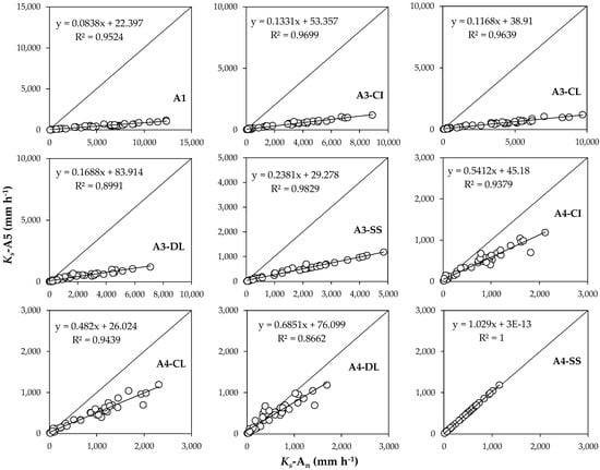 For comparison purposes, the A5 approach, namely, the steady-state version of the simplified method based on a Beerkan infiltration run (SSBI), was compared to the remaining approaches, and the ratio between them (A1/A5, A3/A5, and A4/A5) considered. The SSBI method is reported to be reliable, because it receives exhaustive validation using synthetic and real data [51,59]. In the latter, for example, the SSBI was compared to several methods for Ks estimation, including BEST-steady [60], one-ponding depth method by Reynolds and Elrick [61], method 2 by Wu et al. [62], or approach 4 by Stewart and Abou Najm [34]. The results showed that the SSBI always overestimated Ks, but the differences were negligible from a practical point of view and included at most within a factor of 1.2 [59]. Overall, and regardless of the fitting linearization method, the approaches A1 and A3 returned similar Ks values, as well as similarities between A4 and A5 were observed. Specifically, discrepancies of about 1 order of magnitude (a factor of 11.3) were detected between A1 and A5, while they were within the range of 3.9–7.7 between A3 and A5 and lower than a factor 2 (1.4 as the mean) when A4 was considered. The correlation analysis showed that Ks data were always significantly correlated, but the regression line never coincided with identity one, according to the calculated 95% confidence intervals for the intercept and the slope, except for the A4SS-A5 comparison for which a substantial match between Ks estimations (differences of a factor of 1.03) was found, as expected (Figure 7).