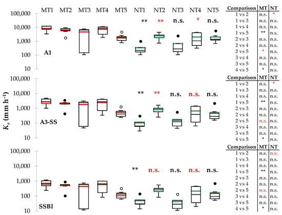 Box plots of saturated hydraulic conductivity (Ks) at different sampling dates for minimum tillage (MT) and no tillage (NT) management systems conducted using the A1, A3SS, and A5 (SSBI) approaches. For a given soil management, inferences of the THSD test between dates (i.e., x vs. y) are summarized on the right (* p < 0.05; ** p < 0.01; n.s. not significant). For a given sampling date, inferences of the two tailed t-test between MT and NT were reported near NT boxes (* p < 0.05; n.s. not significant). For the general interpretation on box plots, please refer to the captions in Figure 2. Note that the discrepancies regarding the statistical significances among the three calculation criteria are shown with red character.